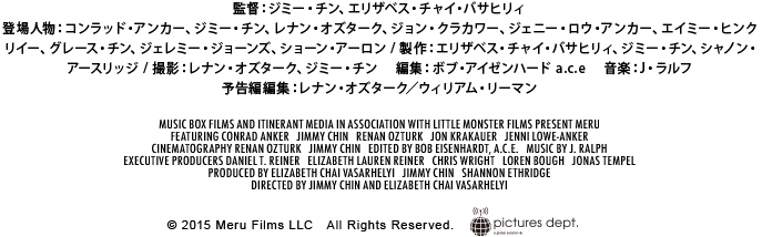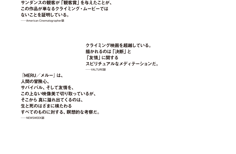 ビッグウォール・クライミング――それはリスクも見返りも大きい危険なギャンブル。聖河ガンジスを見下ろすインド北部のヒマラヤ山脈、メルー中央峰にそびえる“シャークスフィン”のダイレクトルートは、クライマーにとって究極の勲章となり得る難攻不落の岩壁。過去30年間、一人の成功者も出していない、もっとも困難な直登ルートだ。手ごわい難所が連なるこの6,500メートルの峻峰は、百戦錬磨のクライマーにとっても悪夢でしかなく、だからこそ挑戦意欲をかき立てる。90キロの登攀具や食料の入った荷物を背負いながら、雪と氷と岩に覆われた1,200メートルのテクニカルな山肌を登攀することは、チャレンジの入口でしかない。真のシャークスフィンが姿を見せるのはその先。それはクラックや足場がほとんど存在しない、垂直にそびえる花コウ岩。450メートルに及ぶ文字通りの“壁”だ。ベストセラーとなった『空へ―悪夢のエヴェレスト』の著者ジョン・クラカワーは言う。「メルーを制するにはアイスクライミングが巧いだけでは駄目だ。高度に強いだけでもダメ、ロッククライミングの技術だけでも足りない。これまで多くの優秀なクライマーたちがその壁に挑み、敗れてきた。それは今後も変わらない。メルーはエヴェレストとは違う。シェルパを雇ってリスクを人任せにはできない。まったく別次元のクライミングなんだ」。
